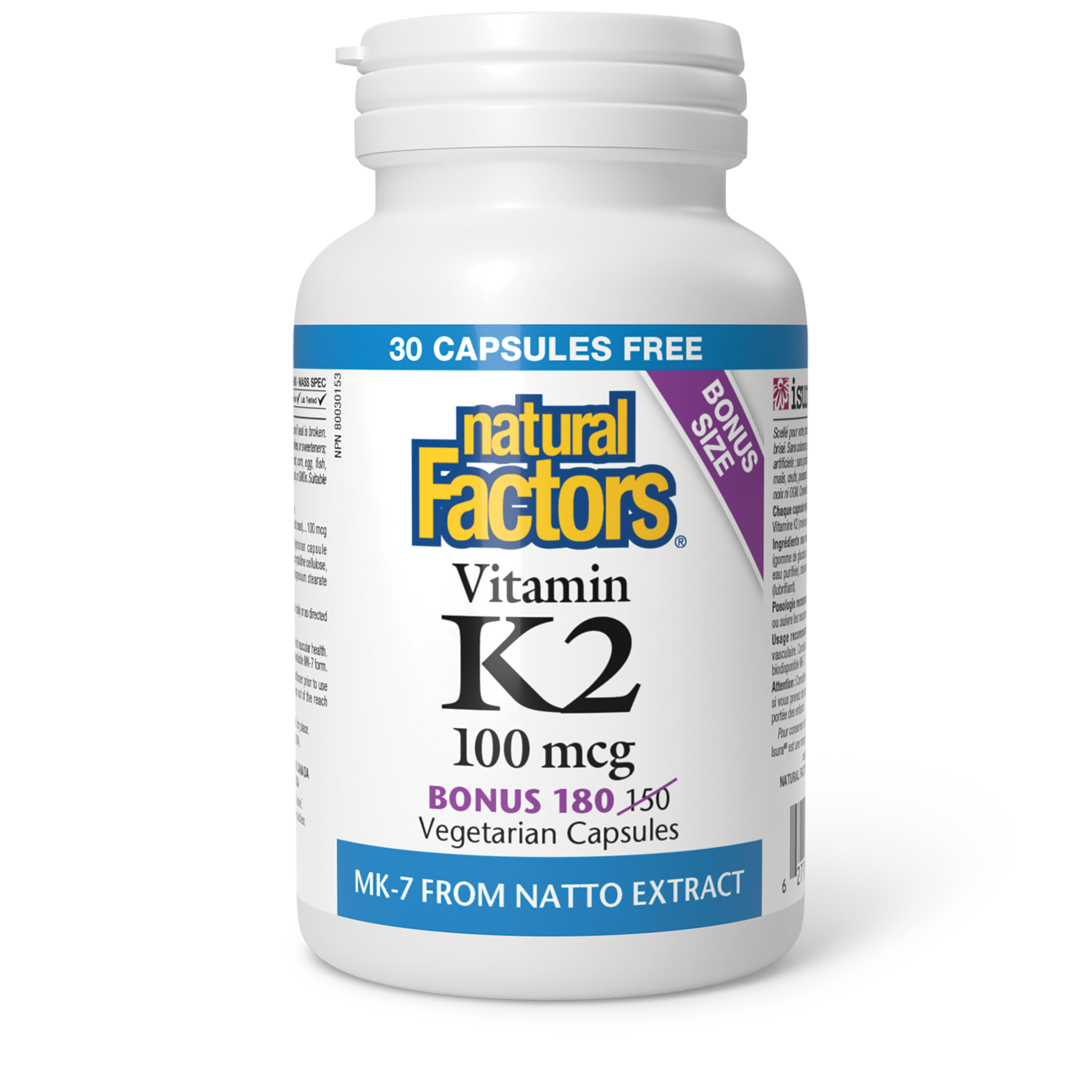 Natural Factors Vitamin K2 contains MK-7, the most bioavailable form of vitamin K derived naturally from natto beans. Each dose provides 24-hour protection by guiding calcium toward the bones and teeth where it is needed most, and away from the arteries where it causes damage.